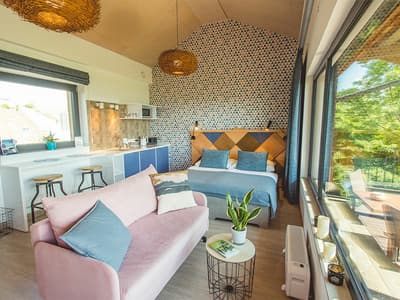 Imaginez-vous vous réveiller au petit matin, dans une ferme stylée et éco responsable, au cœur d’un champ de lavande. Vous n’êtes pas en Provence, mais bien dans un terroir viticole réputé, perché sur la boucle du Danube. Sur un domaine de 2 hectares, cet hôtel mise tout sur une expérience de luxe minimaliste et durable. Dans la maison principale en architecture bois, du mobilier naturel, des teintes claires et des grandes baies vitrées ouvrant sur les jardins. L'hôtel met la gastronomie au centre de l’expérience avec un restaurant à la philosophie slow food qui utilise des produits du terroir et les récoltes du domaine. Côté bien-être, le spa avec sauna en bois et jacuzzi panoramique offre de vrais instants de déconnexion. La salle à manger commune est un espace chill où l’on peut bouquiner, laisser les kids s’amuser avec quelques jeux ou juste profiter de la vue. Côté engagement écolo, l’hôtel mise sur une restauration en circuit court, limite au maximum le plastique à usage unique et valorise ses déchets organiques en compost pour son potager.