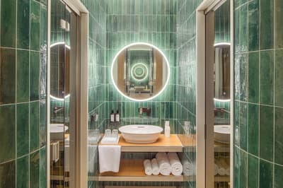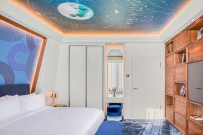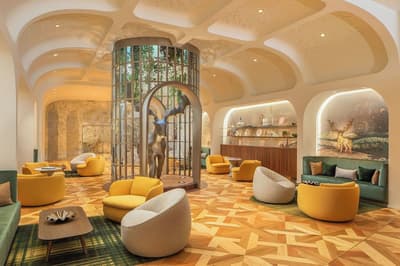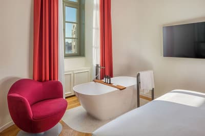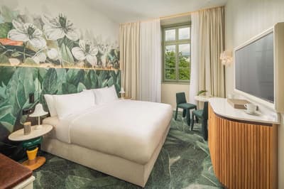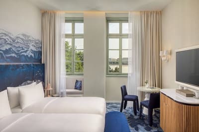 Il a l’air d’un petit palais avec sa façade d’un blanc éclatant, ses fenêtres à moulures et sa grande porte d’entrée dorée où figure un cerf aux bois qui se transforment en branches fleuries. En même temps, le Kimpton Bem Budapest se trouve à l’intérieur d’un manoir historique classé en plein dans le vieux Budapest – rien que ça. Avis aux amateurs d’hôtels haut de gamme et de décor d’un autre temps ! Imaginé par un architecte d’intérieur, ce petit bijou qui mêle folklore hongrois et design moderne compte de facto parmi les plus beaux hôtels de la capitale. Votre chambre a des airs de prairie avec sa moquette à motif de feuilles et sa douce tapisserie où poussent de petites fleurs blanches – à moins que vous soyez plutôt branché mer, auquel cas on vous conseille la chambre marine où de larges vagues d’un bleu profond viennent lécher le sol et les murs. Dans tous les cas, les lits sont très confortables et la salle de bain à carrelages franchement stylée. La vue ? À vous de voir si vous préférez admirer les flots du Danube, le jardin et sa verrière façon cage à oiseaux ou bien les bâtiments de la vieille ville. En parlant de vieille ville, il y a moult sites historiques à visiter dans le coin et vous auriez tort de ne pas prendre un verre au bar situé en rooftop qui ouvre sur le paysage urbain. Notez pour finir que le groupe Kimpton Bem Budapest a été récompensé plusieurs fois pour son engagement en faveur de l’inclusion et de la diversité, et s’efforce également de s’inscrire dans le programme environnemental pensé par le groupe IHG.