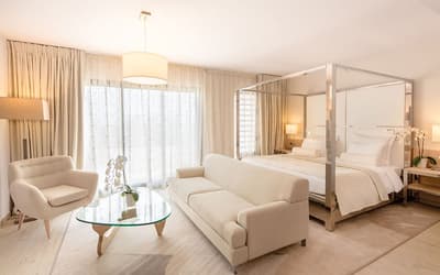 Agréable et purement confortable, c’est le top ! D’une dimension généreuse, la terrasse est aménagée d’un jacuzzi et de beaux fauteuils. Elle accommode un grand lit king et le coin salon est meublé d’un canapé. Salle de bain chic avec baignoire.