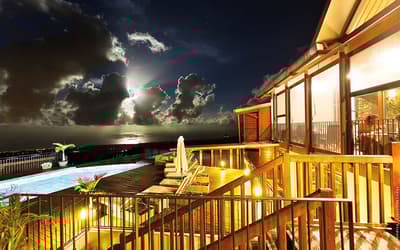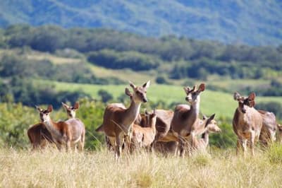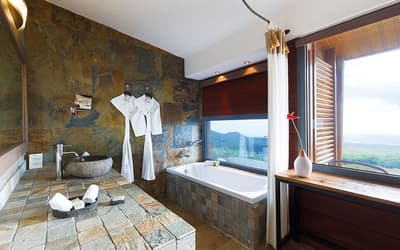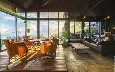 Vous vouliez communier avec la Nature ? Vous êtes pile au bon endroit. Mais pour profiter d’un cadre inégalé, le Lodge se mérite !! La route qui y mène est tortueuse et semble d'abord ne mener nulle part... Sauf que... Situé en forêt, au cœur d’un domaine de 150 hectares, ancien territoire de chasse, le Diana Dea Lodge apparaît dans sa splendeur minérale de bois et de pierre de taille. Si vous croyez apercevoir une biche ou un cerf, ne vous frottez pas les yeux, vous n’avez pas abusé du ti' punch ! Cerfs et biches ne sont pas des mirages. Les animaux vaquent à leurs occupations tranquillement et vous les observerez facilement à l'heure du nourissage. Et à part les cris des oiseaux et les brames des cerfs en saison des amours (juillet-août), vous n’entendrez RIEN ! Pas de route bruyante, pas de klaxons tonitruants, pas de vie fourmillante comme dans une cité balnéaire. Ici règnent le calme et la solitude des grands espaces. A 650 mètres d’altitude, dans la végétation des « Hauts » de la Réunion, vous serez au frais. Idéal pour ceux qui détestent le sable, les plages surbookées et la chaleur ! Tout cela est loin, très loin même. Ne vous inquiétez pas : un bon feu de cheminée revigorera ceux que la fraicheur déroute.