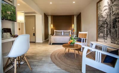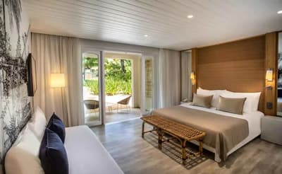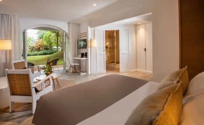 Plus spacieuse, elle est encore plus confortable et agréable avec une banquette dans la chambre. Sa terrasse ou son balcon aménagé, offre une belle vue sur les jardins tropicaux de l’hôtel ou sur la piscine. Elle dispose d’un petit coin salon avec de beaux fauteuils et une petite table en bois.