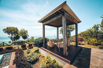 Elle offre une vue remarquable sur les montagnes et l’océan. Sa terrasse aménagée avec un beau fauteuil oscillant en rotin profite de magnifiques levers et couchers de soleil. Ce chalet individuel, procure intimité et confort dans un cadre idyllique. Salle de bain ouverte sur l’extérieur.