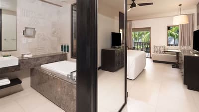 Elle profite d’un balcon ou d’une terrasse privée d'où vous pourrez profiter de la vue sur l’océan ou le jardin. À noter que la salle de bains en marbre qui dispose d'une spacieuse douche à l'italienne à effet pluie et d'une baignoire séparée est accessible en fauteuil roulant.