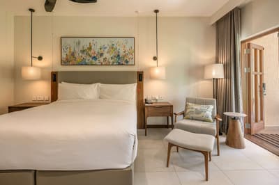 La chambre dispose d'un lit Hilton Serenity et arbore une décoration chic avec un beau carrelage, un mobilier en bois clair, des tableaux à motif exotique ornant le mur, un fauteuil confortable avec pouf pour se relaxer et le coin salon dispose d’un beau canapé pour se détendre devant la télé, le tout dans une dominance de blanc qui créent une atmosphère parfaite pour des moments de détente et de sérénité!