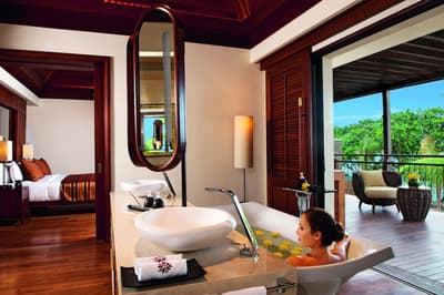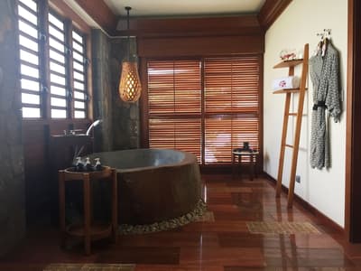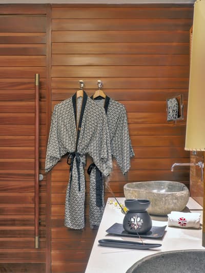 Situé rez-de-chaussée du complexe spa et bien-être de l’hôtel, elle est à proximité des installations de thermothérapie. Elle offre calme et sérénité, pour vivre une expérience immersive authentique et revitalisante. Sa baignoire en forme de cocon est installée dans un coin de la pièce profitant de l’intérieur lumineux. Son jardin privé est entouré de murs de bambou exotique et dispose d’une douche extérieure.
