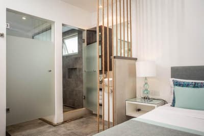 La suite vue jardin se trouve au rez-de-chaussée. C'est l'hébergement idéal pour les familles avec de jeunes enfants, qui auront leur propre chambre. Elle possède une terrasse privée placée dans un joli jardin, à quelques mètres de la piscine et de la plage. La suite dispose de 2 chambres et de 2 salles de bain.