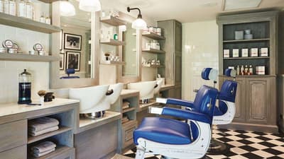 L’ensemble marie une décoration de style chic et retro. Les teintes de bleu marine et de moutarde confèrent à la suite une ambiance de maison de bord de mer.