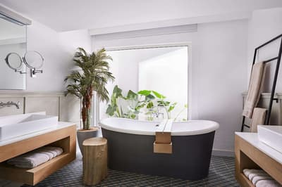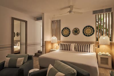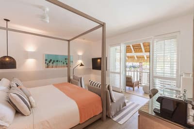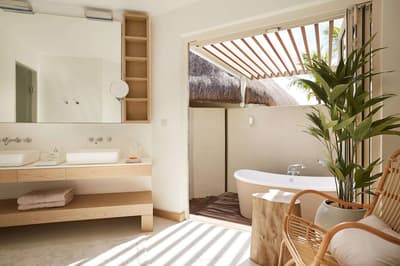 Située au deuxième étage, cette grande suite offre une terrasse avec une baignoire en îlot et des chaises longues orientées sur une belle vue mer. Elle est spacieuse et loge confortablement toute la famille. Le lit à baldaquin complète la suite et fait un petit rappel à la période coloniale.
