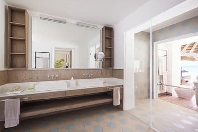 Incroyablement spacieuse, elle a une chambre et un vrai salon avec canapé-lit séparés ainsi que 2 salles de bain. Baignoire et douche, toilettes séparées. Elle s’ouvre sur une terrasse ou un balcon avec vue sur le coucher du soleil et sur le lagon.