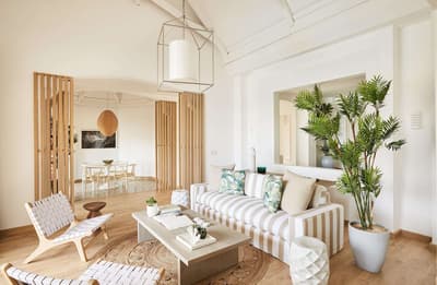 Elle marie une décoration de style chic et retro avec de beaux matériaux. Le parquet et les meubles en bois clair, ainsi que la dominance de blanc rendent l’espace lumineux et accueillant.