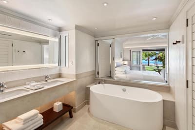 Plus spacieuse, elle peut communiquer avec une autre suite junior, idéal pour les grandes familles. Située au rez-de-chaussée ou au 1er étage elle offre une terrasse ou un balcon aménagé avec canapé et petite table en bois et donne sur les jardins tropicaux. Douche et baignoire dans la salle de bain.