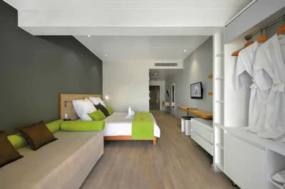 Les chambres sont élégamment décorées dans des tons frais de verts et blancs avec un mobilier en bois blond, le tout dans une ambiance décontractée et chaleureuse !