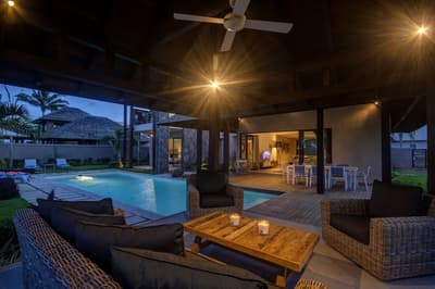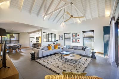L'élégance unique de cette villa vous charmera. Dès que le jour se lève, une lumière douce pénètre harmonieusement les pièces de vie. C'est à l'ombre d'un palmier, détendu sous votre véranda ou devant votre piscine privée que vous accueillez la nouvelle journée. La soirée promet d'être tout aussi agréable grâce à notre talentueux chef qui se fera un plaisir de vous préparer un repas unique et savoureux. La villa possède 4 chambres et 4 salles d'eau. Elle dispose d'une pièce de vie conviviale comprenant un grand canapé, une table à manger ainsi qu’une cuisine ouverte avec un accès direct sur l'extérieur et la varangue en bois. La piscine longe la villa et est entourée d'un jardin tropical paysagé.