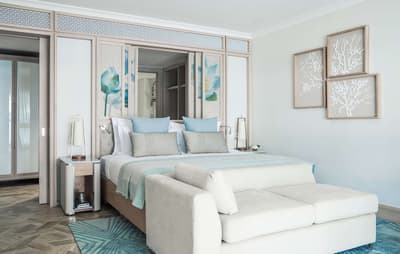 Elle est dotée d'un dressing tapissé de miroirs, d'une salle de bain en marbre avec baignoire indépendante et d'une douche à effet cascade. L’intérieur est décoré sur le thème de la plage, et comporte des tableaux à motif fleuri, et l’ensemble se complète par une dominance de bleu clair qui illumine la pièce. Une atmosphère de détente et de sérénité!