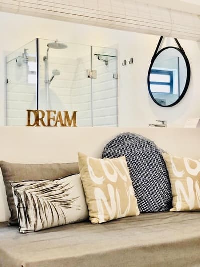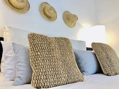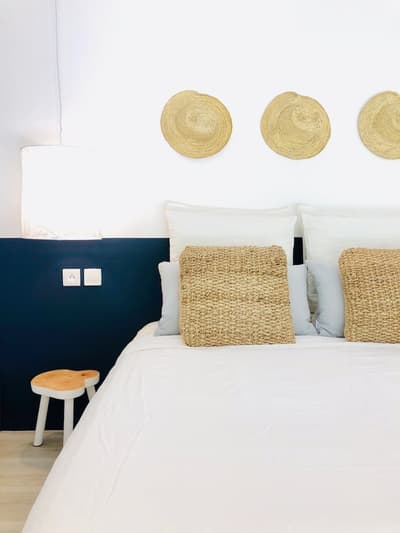Simple et cosy. Des meubles en bois et des touches de rotin donnent un style maison en bord de mer. Le blanc domine la chambre et rend l’espace lumineux. Des tons de bleues parsèment la chambre lui donnant du peps.