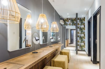 Raffinée et élégante ! Dans une ambiance paisible, la suite familiale ajoute au cadre enchanteur tropical de l’hôtel. Avec des touches de bleu-gris, de la toile de Jouy, et la tête de lit en rotin, elle fait rêver. Les meubles en bois se marient parfaitement à cet intérieur.