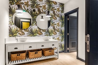 Raffinée et élégante ! Dans une ambiance paisible, la suite couple ajoute au cadre enchanteur tropical de l’hôtel. Avec des touches de bleu-gris, de la toile de Jouy, et la tête de lit en rotin, elle fait rêver. Des photos de scènes de vie sont immanquables. Les meubles en bois se marient parfaitement à cet intérieur.