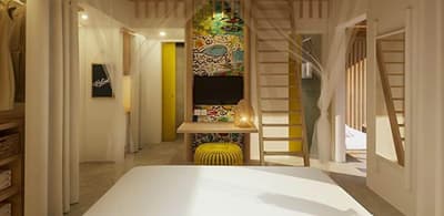 Un espace chaleureux et cosy. Elle est habillée de meubles de différents tons de bois. Son intérieur est lumineux. Des touches de couleurs apportent de la gaité à la pièce. Une peinture murale abstraite est présente face au lit complétant l’ensemble.