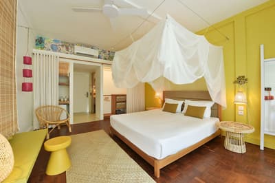 Voilà une adresse atypique qui plait par son style décalé, sa déco vintage, son esprit beach culture. Le Veranda a aussi un esprit communautaire affirmé, qui ne séduit pas seulement les surfeurs de la baie de Tamarin ! Avant d'être repris par le groupe Véranda, l'hôtel appartenait à un jazzman… Dans le hall, vous êtes accueillis par la grande fresque murale de l’artiste mauricien Kim Siew, reproduite dans chaque chambre. Du rooftop, avec petite piscine et bar, la baie semble flotter au milieu des arbres. Ici, à l'aube on guette les dauphins, et le soir le légendaire coucher de soleil... En bas, une autre piscine s'entoure de chaises longues bleues et blanches. Et les amateurs de sports nautiques sont à la fête, car la case nautique propose des équipements, la certification PADI, des séances de plongée, des excursions en mer… Vous tenez l’emplacement rêvé pour débuter en surf, kitesurf, ski nautique, kayak ou bodyboard en toute sécurité ! Et au large, la vague « Cap Dal » attire les surfeurs expérimentés du monde entier. Embarquez au Cap Dal Boat House pour naviguer entre l’île aux Bénitiers ou Crystal Rock, sortir en speedboat pour observer les dauphins, et même les rejoindre en stand-up paddle ou kayak dès 5 heures du matin ! Au retour, vous pourrez laisser le spa Seven Colours rééquilibrer vos chakras ! Cerise sur le gâteau : l'hôtel applique la charte environnementale très précise du groupe Veranda.
