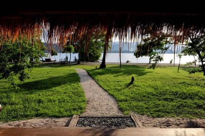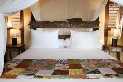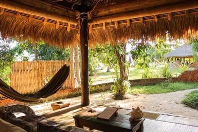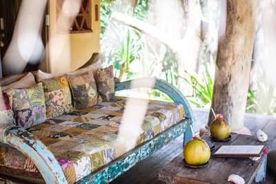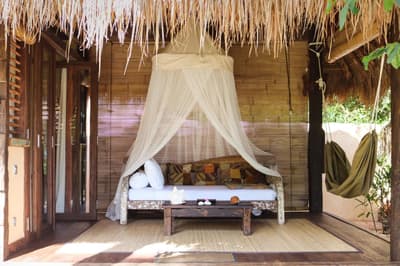 Je suis sûre que vous vous y voyez déjà : une île encore sauvage dans le détroit de Lombok, une plage de sable blanc interminable, un lagon magnifique, des hébergements tous plus charmants les uns que les autres... et un excellent restaurant mi-traditionnel, mi-italien pour mixer les pâtes fraîches et la langouste ! Sans oublier le hamac, l'accessoire indispensable à toutes vacances idylliques qui se repectent ! "Etre en pleine nature sans renoncer au confort" est bel et bien la devise de cet écolodge les pieds dans l'eau. Le design n'a pas été sacrifié sur l'autel de la simplicité. Tout ce qui a été fabriqué ici, à partir de matériaux naturels, a été réalisé par des artisans locaux, supervisé par le manager... italien. D'où ce sens de l'esthétique incroyable ! On aime ces lampadaires montés sur des souches polies et ces stores en bambou parés de coquillages. Dire que les tissus ont été teints par les villageois ! On adore ce salon à l'air libre, de style tribal, où de grands daybeds en bois flotté vous capturent à l'heure de la sieste, face à la mer. Au crépuscule, des feux de joie sont allumés pour chanter des chansons et observer les étoiles...