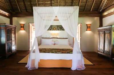 Idéal pour ceux qui recherchent la sensation de "Crusoé" avec quelques conforts supplémentaires, il offre une vue sur une plage immaculée que vous pourrez contempler du hamac et des eaux cristallines peuplées de jardins de coraux aux couleurs vives et de poissons tropicaux. À noter que le canapé de la terrasse peut être converti en lit d'appoint avec moustiquaire pour accueillir une troisième personne.