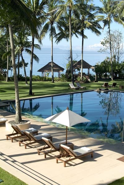 Au Alila Manggis, vous préfèrerez probablement davantage le cadre général aux chambres, même si celles-ci sont lumineuses, modernes, fonctionnelles, avec de grandes baignoires et de vastes lits, et un équipement plutôt complet si on se réfère aux normes et habitudes hôtelières. Car pour le reste, le resort est situé au cœur d'une plantation de cocotiers, ce qui est déjà pas mal, avec un joli pavillon à l'ancienne pour manger - le petit dej est inclus -, un autre sur un promontoire dominant la baie pour boire un verre, et une grande piscine sympa, sans oublier le spa avec vue - le tout bercé par les bruits charmants du vent, des oiseaux, des grenouilles et insectes chanteurs. Quelques activités classiques en Asie (sport nautiques, yoga ou taï chi) tombent à pic pour rythmer les journées de vacances ; car ici, à l'image des pavillons grand ouverts sur des vues agréable, on vit dehors et profite, comme d'une belle propriété familiale gazonnée où tout le monde se retrouve, ne regagnant la chambre que le temps d'une sieste ou pour savourer une bonne nuit.