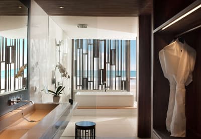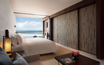 Elle profite d’une vue époustouflante sur l’océan ! La chambre se prolonge sur le balcon aménagé de beaux fauteuils. Elle offre un accès direct et privilégié à la plage. Petit salon dans un coin de la pièce. Salle de bain chic avec une baignoire et une douche à effet de pluie.