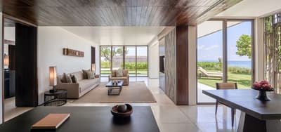 À quelques pas de la plage, elle y offre un accès privilégié. Entourée par la végétation luxuriante, elle baigne dans une atmosphère calme et sereine. Très spacieux, le salon dispose de canapés-lits et de fauteuils confortables. Salle de bain chic avec douche à effet de pluie.