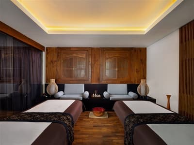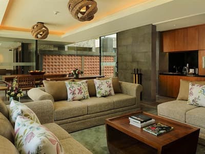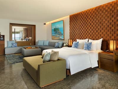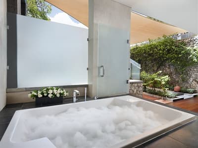 Ce petit paradis tropical est installé parmi la végétation luxuriante du complexe et baigne dans une atmosphère sereine et calme. Elle procure intimité et confort dans un cadre très privé. Sa terrasse est aménagée de fauteuils, d’un jacuzzi et offre un accès direct à la piscine. Très spacieuse, son coin salon est meublé de canapés très confortables. Salle de bain avec douche à effet de pluie.