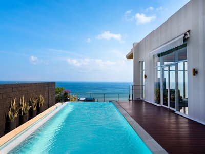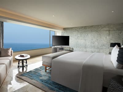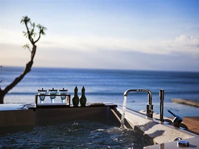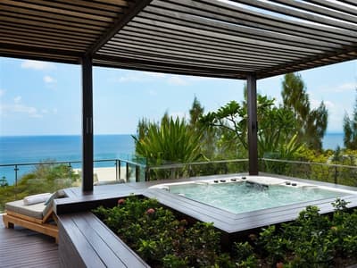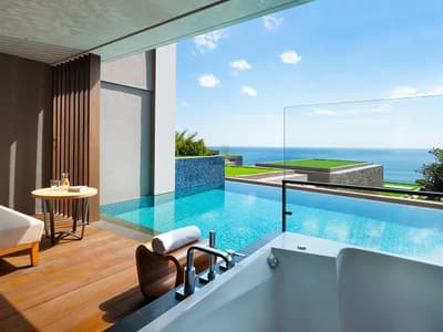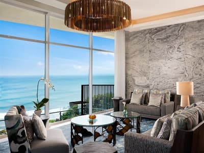 En front de mer, cette belle suite est installée sur la falaise et profite de merveilleuses vues sur l’océan. Son espace extérieur profite d’une belle piscine et d’un grand balcon avec un jacuzzi et une banquette pour apprécier l’air frais. Très spacieuse, son coin salon est meublé de canapés très confortables. Salle de bain avec douche à effet de pluie.