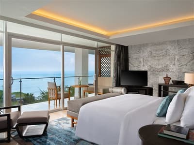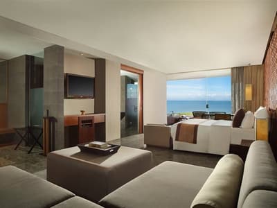 Installée en hauteur, cette belle suite profite d’une vue époustouflante sur l’océan. Son grand balcon est aménagé d’un jacuzzi et une banquette pour apprécier l’air frais. Très spacieuse, elle peut accommoder un lit King ou 2 lits doubles et dispose d’un coin salon avec des canapés très confortables. Salle de bain avec double douche à effet de pluie.