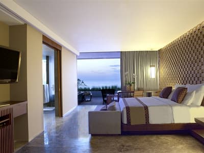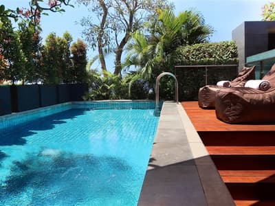 Parfaite pour les couples, c’est un vrai sanctuaire ! Son espace extérieur profite d’une belle piscine et d’un grand balcon avec un jacuzzi et une banquette pour apprécier l’air frais. Très spacieuse, elle peut accommoder un lit King ou 2 lit doubles et dispose d’un coin salon avec des canapés très confortables. Salle de bain avec double douche à effet de pluie.