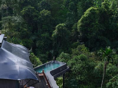 Pandora, ça vous dit ? Parce que le Capella Ubud y ressemble sérieusement. Pour les incultes qui ne connaissent pas la planète d’Avatar, les couleurs y sont particulièrement brillantes, surtout le bleu et le violet néon. Bah là, c’est tout pareil ! Vous vous croirez sur une autre planète tant les couleurs y sont différentes d’ailleurs : bien plus saturées, bien plus profondes, bien plus propices à l'émerveillement ! Vous serez au milieu de la forêt tropicale, comme les Na’vis. Puis, une fois venue l’heure du coucher de soleil, vous repenserez bien à ce qu’on vient de dire, car ce mélange de violet et d’orange au milieu des arbres est juste unique au monde. Pour vivre l’expérience totale, sachez que vous dormirez dans des tentes ouvertes sur l’extérieur, que vous rejoindrez par des ponts suspendus en bois. Histoire de ne jamais quitter cet environnement traditionnel magique ! Mais attention, ce sont des tentes grand luxe avec piscine, qui garantissent évidemment l’intimité et une sécurité totale. Il y a beaucoup d’hôtels de luxe, surtout à Bali, mais le Capella Ubud est sûrement celui qui vous procurera l’expérience la plus inoubliable.
