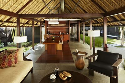 Elle donne sur la piscine privée et le jardin tropical et profite d’un bel espace de vie aéré qui reste en harmonie avec l'environnement. Dotée d'un coin repas et d'une cuisine fonctionnelle vous savourerez votre petit déjeuner sur commande chaque matin, préparé par votre majordome personnel.
