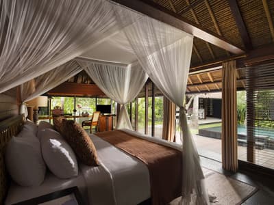 Confortable et intime, elle bénéficie d’un style de décoration raffiné et lumineux. La chambre principale comprend un lit à baldaquin équipé de lin blanc et la salle de bains adjacente en plein air est inspirée du spa avec une grande baignoire pour deux personnes. Un studio séparé fait office de chambre supplémentaire pour lire ou profiter d'un massage dans la villa. Une très belle atmosphère de vacances !