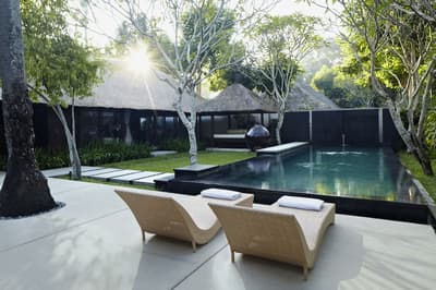 Située dans un vaste jardin balinais, elle est dotée d'une piscine de taille généreuse et d'un gazebo au toit de chaume traditionnel. Elle profite d’un bel espace de vie pour se détendre et peut accueillir confortablement deux personnes.