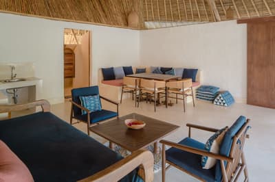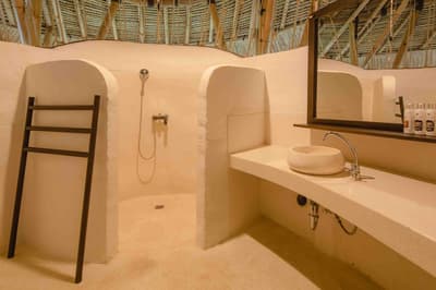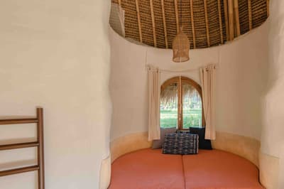 Son architecture traditionnelle offre néanmoins un confort exquis. Complètement construite de matériaux naturels, elle est proche de la nature. De belles lampes et des décorations en osier parsèment la pièce pour une touche d’exotisme. L’ensemble est minimaliste et épuré. Quelques touches de couleurs égaient le tout.