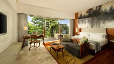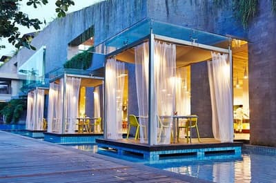 L’éco-brutalisme, ça vous dit quelque chose ? S’il ne fallait qu’un mot pour définir le Maya Sanur, ce serait celui-ci ! Avec son architecture marrante, bizarre, industrielle -selon les points de vue- mais universellement originale et pleine de végétation, vous vous croirez dans un monde à la Hunger Games. Le battle royale en moins ! Le balcon de votre chambre ressemblera à une sorte de baril avec des barres de fer mais le truc le plus cool que vous verrez, ce sont tous ces couloirs de lagons qui se faufilent à travers le complexe. Ainsi, si vous êtes au rez-de-chaussée, vous aurez un accès privilégié à la piscine, ouais ! Imaginez-vous, assis sur le fauteuil de votre terrasse et, quand l’envie vous prend, libre à vous de faire un petit plouf. Encore mieux, celle-ci se termine en bord de plage. Donc vous n’aurez qu’à faire trois pas pour passer de l’eau douce à l’eau salée. En plus de tout ça, c’est le grand luxe ! Une fois sur votre transat, vous n’aurez qu’à appuyer sur un bouton pour qu’on vous apporte une boisson ou un snack. Vous pourrez également profiter d’un déjeuner flottant dans le lagon ou bien d’un pique-nique sur les grandes étendues de gazon des rooftops. Décidément…