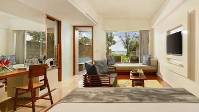 Installée au rez-de-chaussée, elle est entourée par la végétation luxuriante du complexe. Sa piscine semi-ouverte est tout ce qu’il faut pour se relaxer. Sa terrasse est aménagée d’un lit de séjour et de belles chaises pour apprécier le cadre. Elle accommode 1 lit King et dispose d’un petit coin salon avec une belle banquette et un canapé-lit. Salle de bain avec une baignoire circulaire.