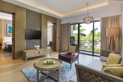 Plus spacieuse, cette suite junior est idéale pour un séjour tranquille en amoureux ou en solo. Elle profite d’une jolie vue sur la piscine et dispose d’un balcon privé d'où vous pourrez admirer la vue environnante.