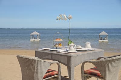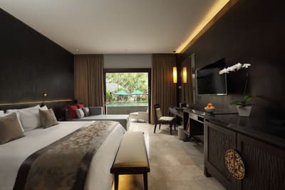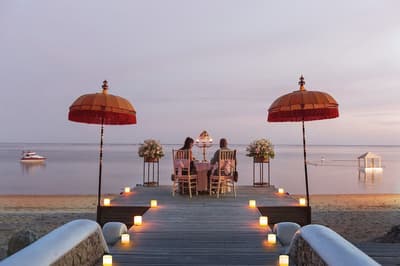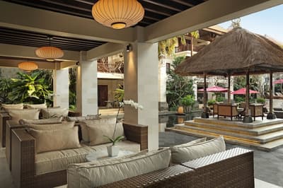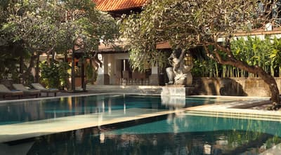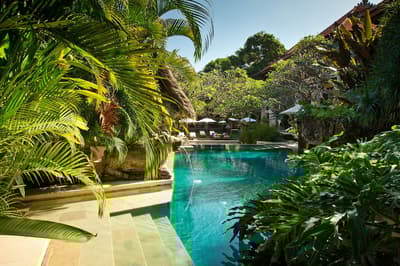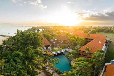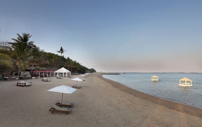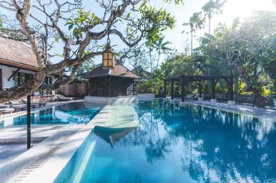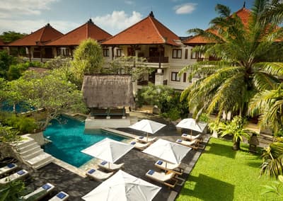 Au Puri Santrian, vous serez accueillis par un énorme gong ! Non, non, vous ne rêvez pas, les employés de la réception frappent le gong pour chaque nouvel arrivant. Amusant. Voilà à quel point vous serez important là-bas. Et accrochez bien vos ceintures car ce ne sera que le point de départ d’un millier de petites attentions de la part du staff. L’hôtel est au milieu du tas de resorts de Sanur et pourtant, vous n’en aurez absolument pas l’impression. Premièrement, tant l’ambiance est chill. Deuxièmement, car il a tout simplement l’air perdu au milieu de nulle part. Des petites allées vous mènent aux piscines remarquables, où l’eau est d’un TURQUOISE ! Et ce n’est qu’une petite partie d’une palette de couleurs absolument splendide. Le genre d’endroit qui vous fera échapper un « WOW ! » à haute voix sans que vous vous en rendiez compte. Les levers de soleil sur la plage sont juste époustouflants, il faut le voir pour le croire. En fin de journée, c’est du côté du Beach Restaurant qu’il faut se rendre pour voir ces belles couleurs chaudes. Il y a même une piscine-bar s’il vous plaît… Allez, tapez dans le gong en partant ? Histoire de boucler la boucle. On ne vous dénoncera pas !
