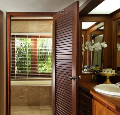 Plus spacieuse, elle procure espace et confort. Entourée par la végétation luxuriante, elle baigne dans une atmosphère calme et relaxante. Sa terrasse est aménagée de belles chaises en rotin. Petit coin salon avec un canapé-lit et une petite table. Salle de bain avec douche à effet de pluie.