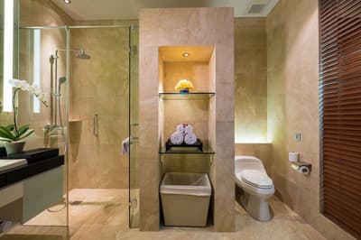 Elle a tout le nécessaire pour un séjour confortable et agréable. De beaux fauteuils sont installés dans un coin de la pièce pou un moment de détente. Salle de bain chic.