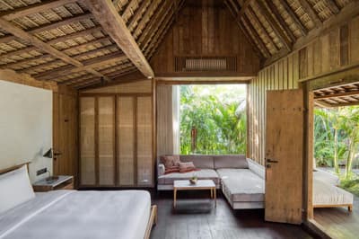 Très rustique, elle est faite de bois et de bambou. Le bungalow est en harmonie avec la nature environnante pour un séjour au calme et couper du quotidien. Très ouverte, elle laisse la lumière pénétrer dans son ensemble, créant une pièce lumineuse. Elle bénéficie d’une décoration organique et authentique. Ses pièces tressées, en osier et en rotin, rendent l’ensemble encore plus exotique.
