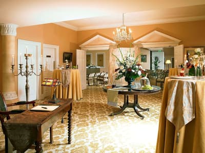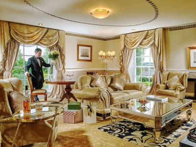Richement décorée, elle comprend de beaux meubles anciens, des impressions artistiques originales, une cheminée en marbre flanquée de fauteuils et un canapé luxueux. Elle comporte une table à manger antique et un son surround qui s’ajoutent à la splendeur du salon. La chambre est dotée d’un lit king size avec des textiles moelleux, des draperies en soie et une cheminée à foyer ouvert, qui rehaussent l'ambiance enchanteresse de cette chambre des plus exquises. Adjacent à la chambre principale se trouve un dressing spacieux avec de grandes armoires anciennes et une coiffeuse. Les deux salles de bains disposent d'une gamme de produits et d'huiles Elemis Spa, de peignoirs et de pantoufles. Ambiance royale !