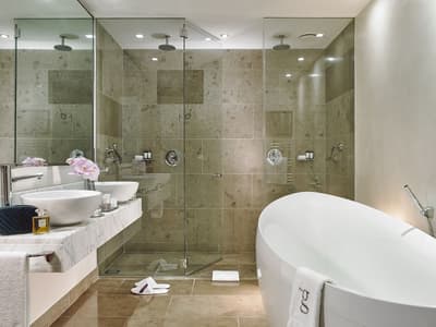 La vue est superbe ! Cette belle chambre a tout ce qu’il faut pour un séjour merveilleux. L’atmosphère est sereine et reposante. Elle accommode un grand lit ou des lits jumeaux et le coin salon est meublé de beaux fauteuils. Salle de bain avec douche à effet de pluie.