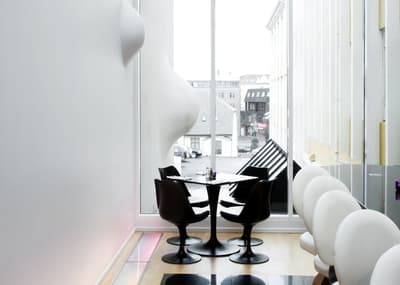 C'est le boutique-hôtel le plus VIP de Reykjavik, quoique savamment planqué derrière la façade années 30 et un peu rigide de l'ancien siège du parti Social-Démocrate. Les vedettes en goguette en Islande se refilent l'adresse, rassurées par sa chiquissime discrétion. Le 101 Hotel, qui emprunte son nom au code postal le plus classe de la capitale (un peu comme si vous descendiez au cœur du Triangle d'Or), a intégré le club très sélect des « Design Hotels » grâce à une architecture d'intérieur qu'ont mitraillé tous les photographes des magazines de déco. Le noir du mobilier laqué, le gris de la roche volcanique offrent des tonalités d'hiver et une impression de paysage islandais que confirment les tables du lounge taillées dans des troncs d'arbre et un fauteuil en simili peau de poney flanqué d'un dossier à crinière. Ah, et n'oublions pas les parquets : l'hôtel raffole des beaux planchers en chêne qui vous réchauffent une ambiance en moins de deux. A propos d'ambiance, celle qui s'échappe des bars du quartier (on est à deux pas de la rue Laugevavur !, ainsi que de l'opéra d'ailleurs) a un peu tendance à monter vers les étages. Faites comme elle, demandez une chambre haut perchée, la vue n'en sera que plus belle sur la montagne Esja.