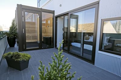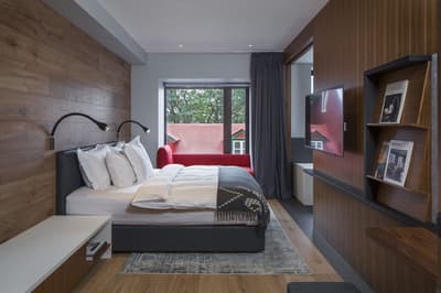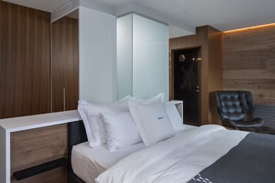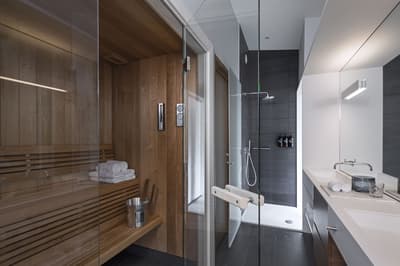 Installée aux étages supérieurs, elle profite d’une vue superbe sur la ville. Le balcon mène à un sauna privé. Très spacieuse, elle accommode un lit double et dispose d’un salon meublé d’un canapé-lit et d’une table à manger. Salle de bain avec douche.