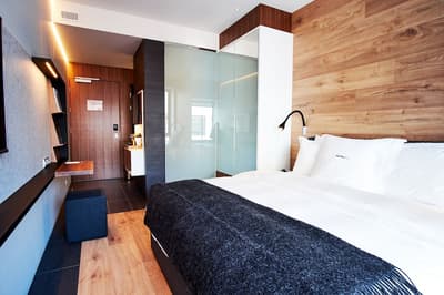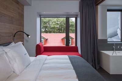 Quand ce boutique-hôtel de 18 chambres a ouvert ses portes en 2017, les fous de design l'ont instantanément inscrit sur leur tablette. Descendre à Reykjavik, oui, mais au Ion City Hotel, encensé pour sa déco décalée, ses vues perchées tutoyant la skyline et sa cuisine méditerranéenne chaude comme la braise. Il a tout ce qui fait un parfait établissement labellisé Design Hotels™ : il occupe un bâtiment classique mais rénové dans la rue la plus cool de la capitale, son architecture intérieure marque assurément les esprits et la culture locale s'invite partout, depuis les murs en pierre de lave dans les salles de bains jusqu'aux bijoux portés par les membres du personnel. Pour être honnête, les architectes du duo Minarc, chargé de son aménagement, ne sont pas des débutants : ils ont déjà transformé en 2013 le logement des employés d'une ancienne centrale géothermique en hôtel sur pilotis, fiché comme un insecte de béton au milieu des champs de lave, le Ion Adventure Hotel près du Parc National de Thingvellir. Ne vous fiez donc pas aux couleurs organiques du Ion City Hotel, Minarc s'est aussi carrément lâché à Reykjavik. Avec une touche futuriste dans les corridors qui mènent aux chambres : ils sont tapissés de miroirs (pour une impression de tunnel sans fin) et de panneaux noirs fracturés par des lignes lumineuses. Ce sont vos mouvements qui allument la lumière et plus vous avancez, plus le couloir semble se rétrécir... Brrr ! Mais dans les chambres, même standards, tout est cosy, contemporain, suspendu entre l'effervescence de la ville et la ligne bleue des montagnes.