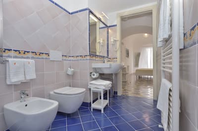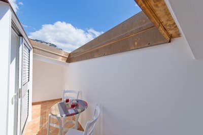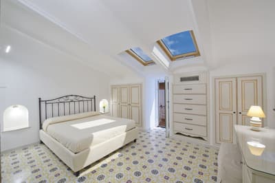Lumineuse, cette luxueuse chambre profite de grandes lucarnes qui permettent au soleil de briller et d'illuminer les carreaux de céramique colorés peints à la main de Vietri sul Mare. Idéale pour un séjour romantique, elle dégage une atmosphère particulière typique de la côte amalfitaine. À l’extérieur, dans le petit espace privé avec table et chaises, vous pourrez respirer l'air frais et parfumé et vous perdre à contempler l'horizon pendant des heures.
